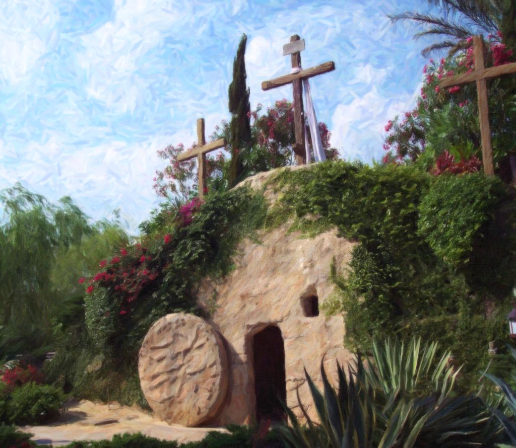 Tło do Grobu Pańskiego w formacie 200×200 cm przedstawiające symboliczną scenę trzech krzyży na Golgocie. Ta głęboko poruszająca dekoracja pomaga stworzyć w świątyni atmosferę sprzyjającą przeżywaniu tajemnicy Paschalnej, łącząc ból Wielkiego Piątku z nadzieją poranka Wielkanocnego.