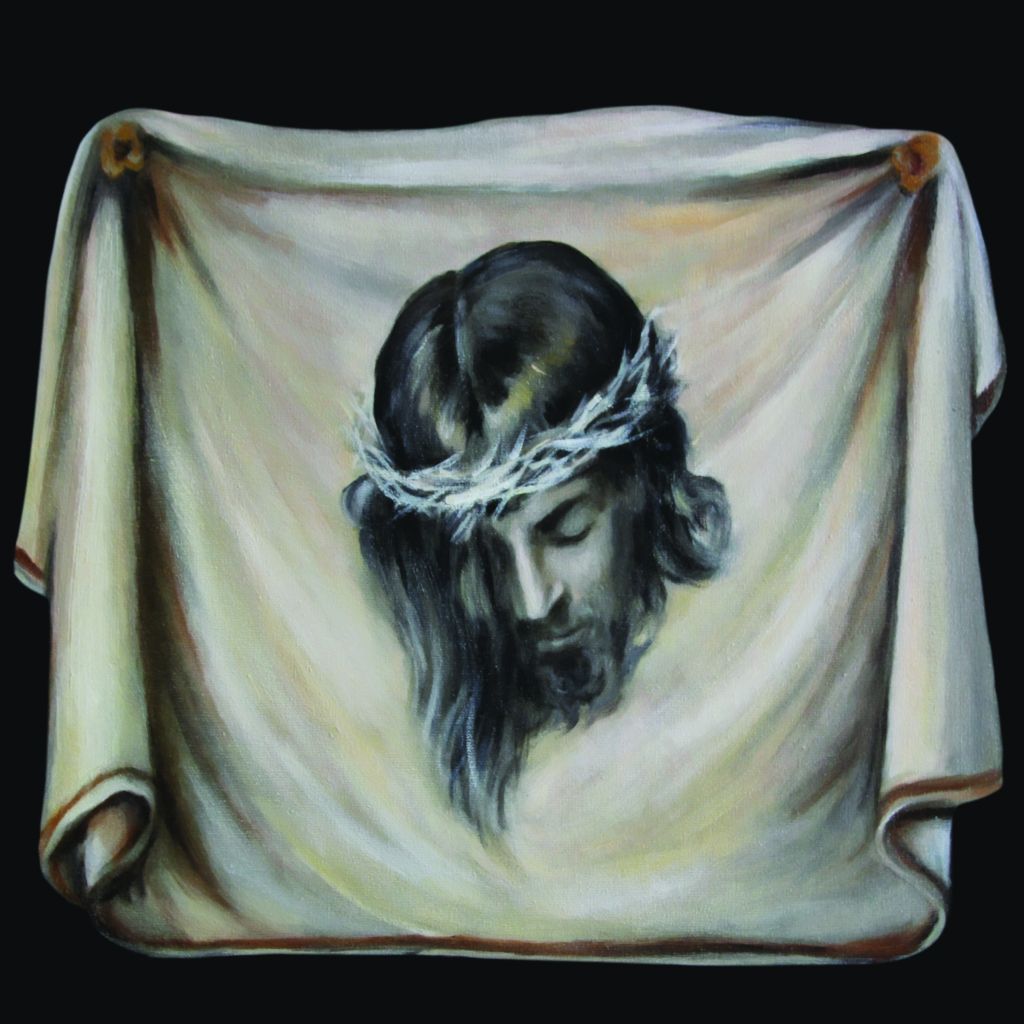 Chusta św Weroniki tkanina dekoracyjna to przejmująca i realistyczna reprodukcja wizerunku Chrystusa, stworzona z myślą o godnej oprawie Triduum Paschalnego.