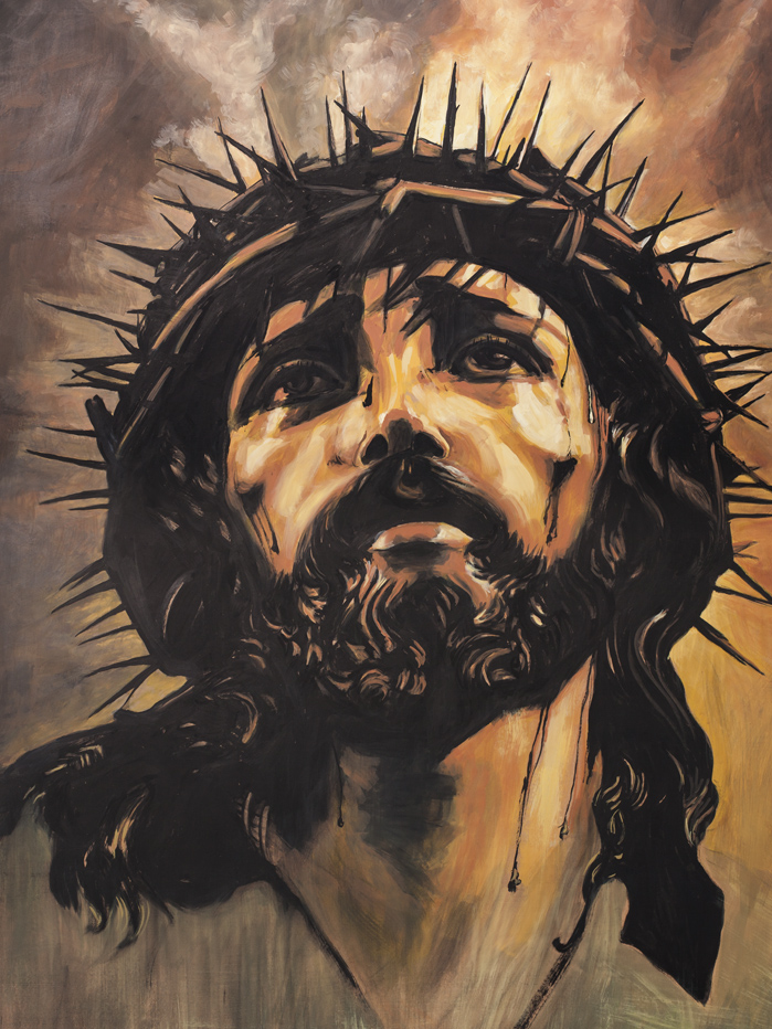 To głęboko poruszające, malarskie przedstawienie Oblicza Chrystusa w koronie cierniowej, utrzymane w nastrojowej palecie brązów, ugier i złota.