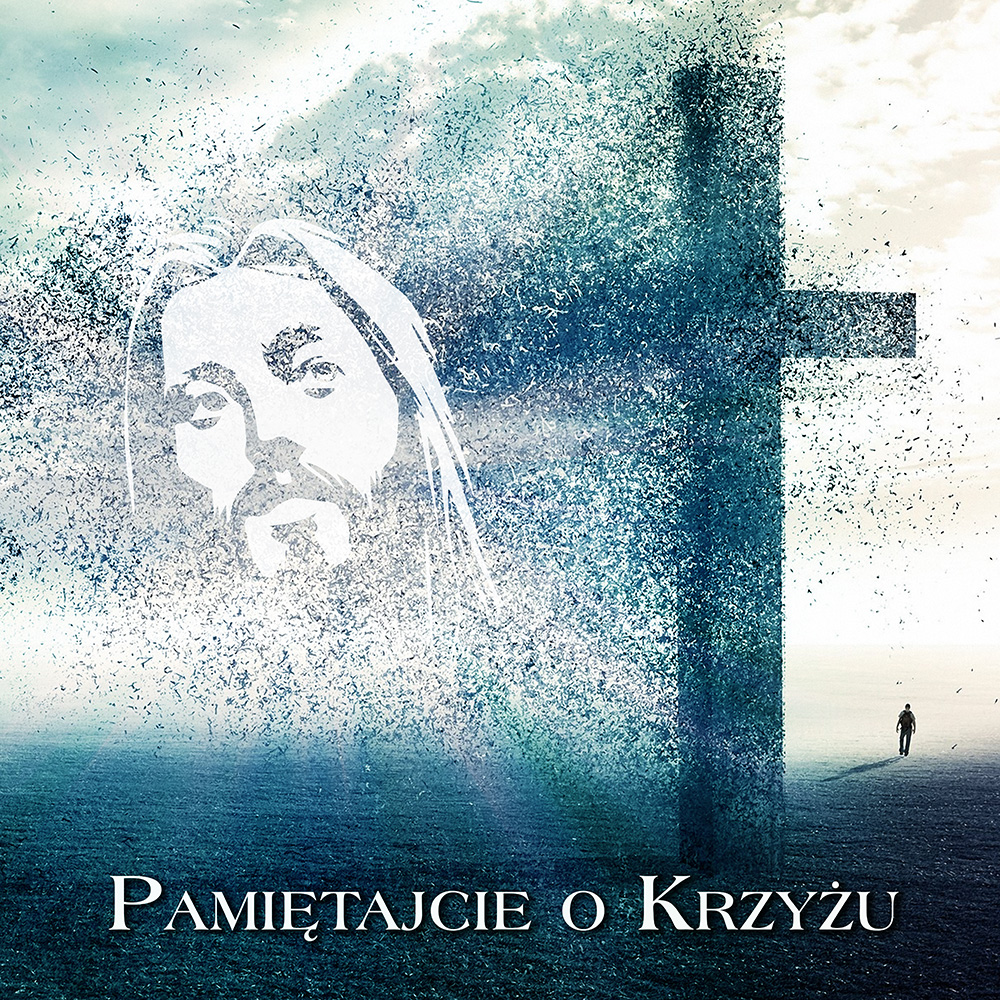 Artystyczna, błękitna kompozycja z napisem „Pamiętajcie o Krzyżu”. Przedstawia symbolikę rozproszonego krzyża i oblicze Pana w unikalnej, jasnej kolorystyce.