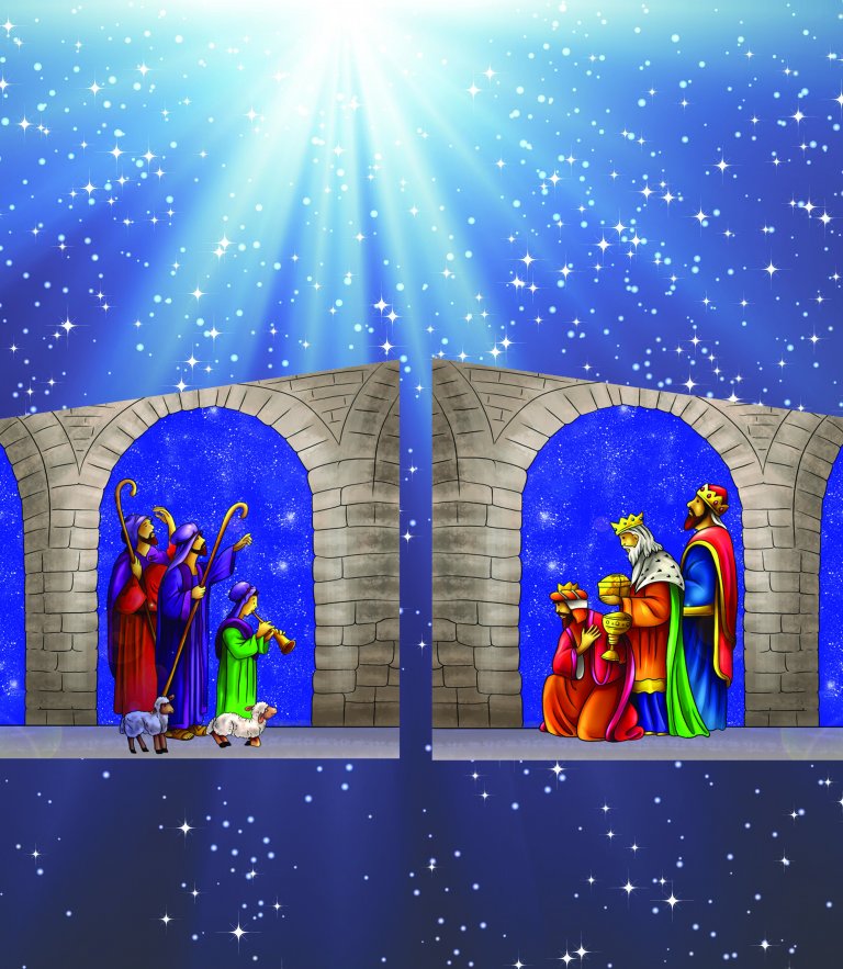 Wykonany z trwałych, wysokiej jakości materiałów, odpornych na warunki atmosferyczne i intensywne użytkowanie — idealny na jasełka, msze i parafialne uroczystości oraz jako stałe tło do szopki.